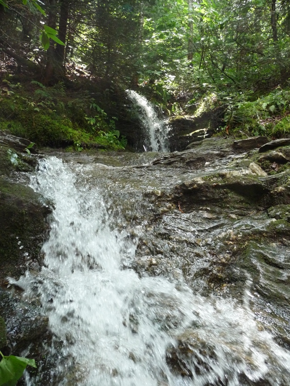 The actual hike was the most interesting we’ve been on during this trip. Much of the trail is a shallow brook that bubbled around rocks and over our feet as we made our way up the mountain. Countless tiny waterfalls sprang from nearby rocks and cascaded across our path. At the top, a large flat rock at the tip of Sterling Pond offered a welcome place to take in the stunning views and catch some sun–and our breath.