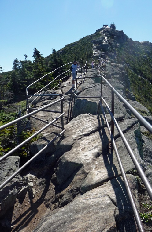 The road ends just shy of the apex, at a parking lot and “Whiteface Mountain Castle.” Built with the granite excavated during construction of the toll road, the castle now houses a café and rest rooms. From there you can reach the summit by two distinct routes: the quarter mile “Stairway Ridge Trail” or an elevator through the center of the mountain. Each has its merits, so plan on doing both. We hiked up the “Ridge Trail,” which winds directly up the north slope of the mountain, mostly over boulders but occasional steps as well. It’s a neat hike with excellent views the whole way.
