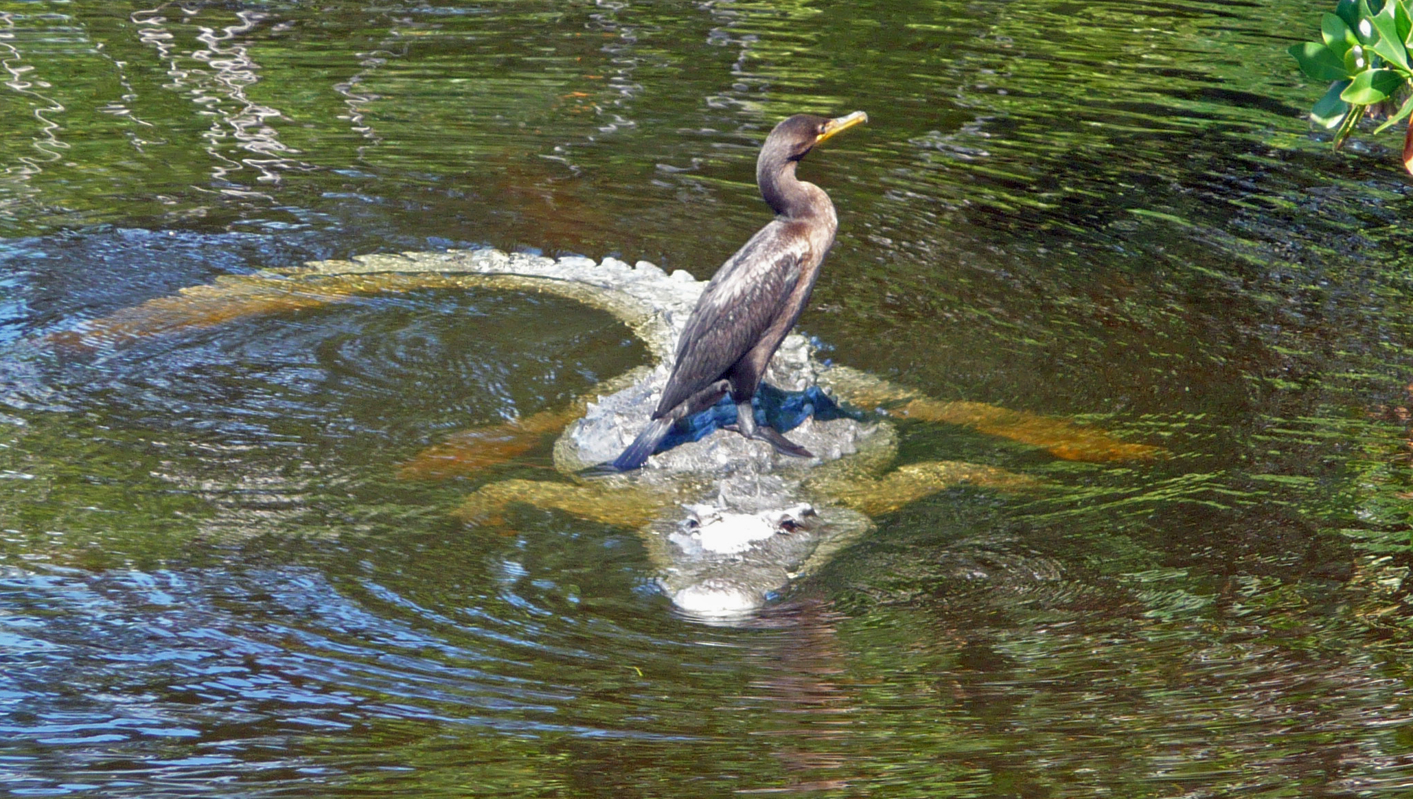 So here we have a Double-crested Cormorant riding on the back of a crocodile. A National Parks Ranger told us she’d never seen anything like this before in her 15 years at the park, and doesn’t expect to see it again. Which isn’t surprising because it isn’t every day you see prey riding its predator like a birthday party pony.