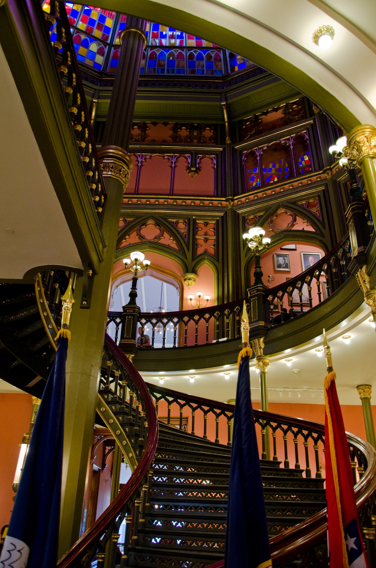 From the outside, the Old State Capital resembles a medieval style fortress set imposingly on a hill overlooking the Mississippi River. On the inside, a commanding cast-iron staircase spirals upward through the center of a multi-storied rotunda decorated in dark wood and marble. Juxtaposing the richly appointed interior, a brilliantly hued stained glass dome – supported by a single central pillar – makes the entire rotunda feel as if it is enclosed within a carnival tent. The contrast should be jarring, but I found it fascinating instead.