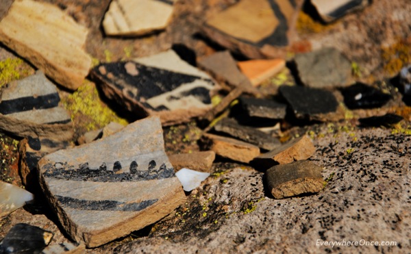 Ancient pottery shards surprisingly just left along the Tsankawi trail. We took our photograph and left the relics for the benefit of the next traveler, who will hopefully return the favor.