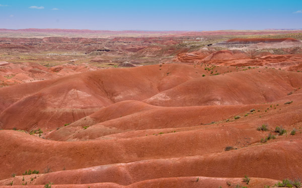 A short drive away, the blue bentonite clay hills disappear into the rolling red velvet carpet of the Painted Desert.