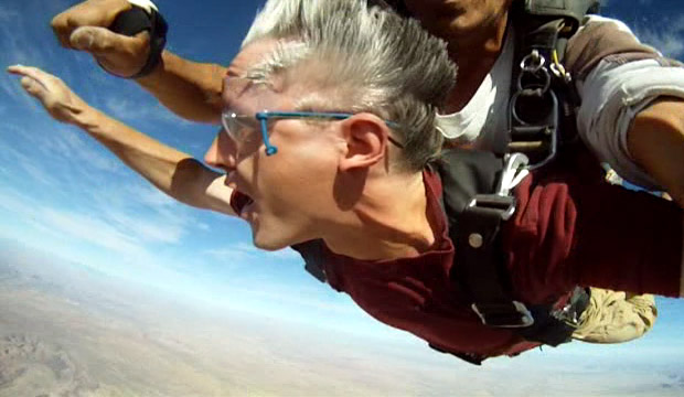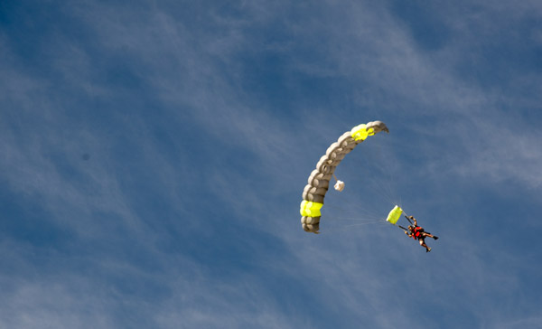 Time stopped. The thirty seconds of our freefall went on for glorious ages. With arms outstretched we surfed the air. In complete control, Pat spun us in a circle so we could take in the 360-degree panorama. All too soon, a rough jolt wrenched us vertical as the parachute unfurled, gained purchase, and slowed our descent.
