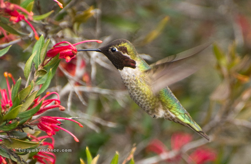 Every spring hoards of hummingbirds descend on U.C. Santa Cruz to harvest nectar from its Arboretum’s blooming buds. We followed them there entirely unprepared for what we’d find. Prior to this excursion we had only encountered solitary birds at artificial feeders, and even then, only rarely. To say that we knew little of them or their ways really gives us more credit than we deserve.