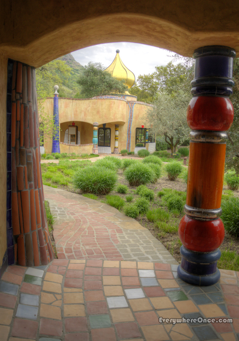 The most imaginative architecture is at Quixote Winery, named for sixteenth-century novelist Miguel Cervantes’ chivalry-obsessed knight errant. The quirky structure looks like a storybook realm come to life, designed by an architect whose vision teemed with turrets and bold colors and who didn’t believe in using straight lines.