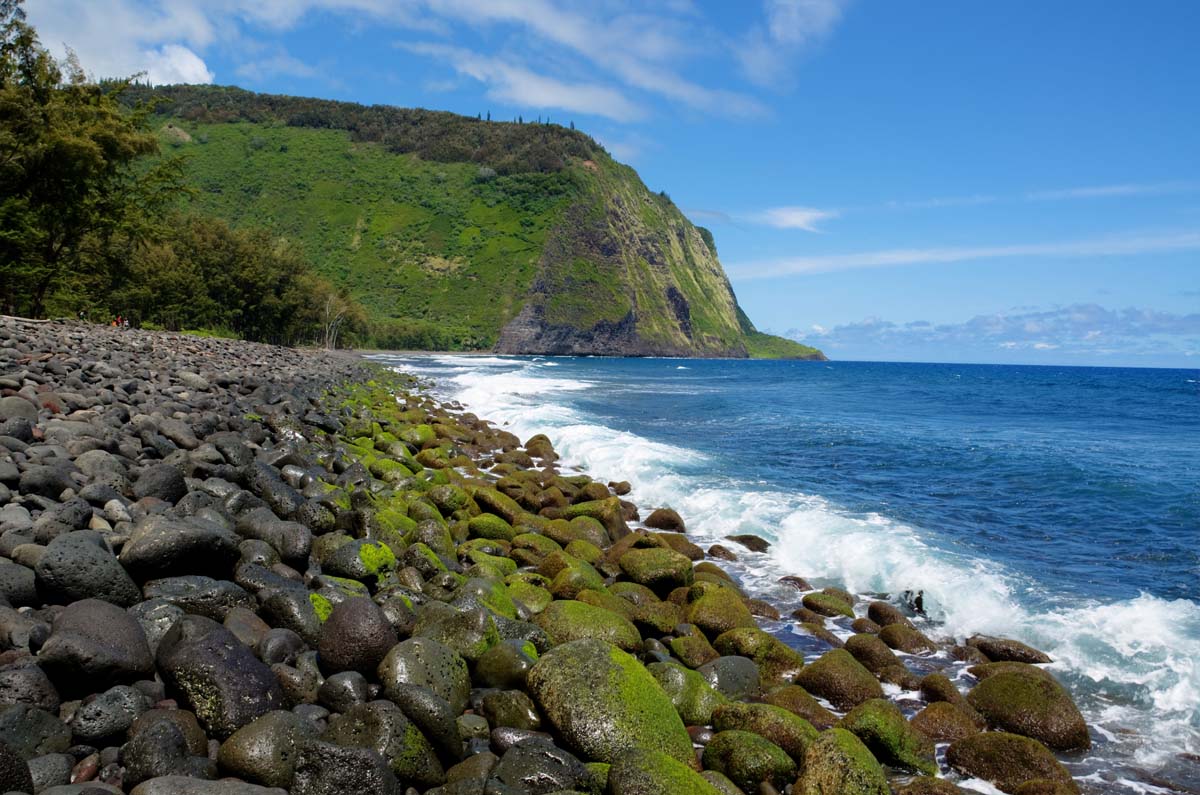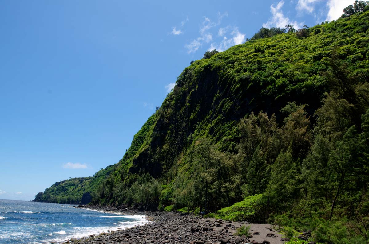 We could see it far below; a thin crescent of ashen sand that split the emerald green valley from the azure blue ocean. The views from Hawaii’s Waipio Valley overlook are satisfying enough that there really wasn’t much need to climb down the roughly 1,000 feet to the valley floor. But we had never seen a black sand beach before and wanted to take a closer look.