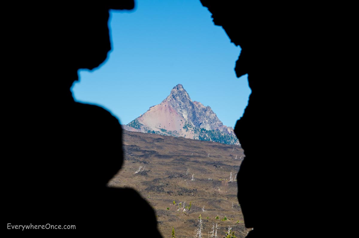 A castle-like structure rises out of the rocky black landscape at the summit of McKenzie Pass in the Cascade Mountains. Built in 1935 with lava from the site, the observatory (named for a Civilian Conservation Corps foreman who worked on it) has open windows strategically placed for optimal viewing of the surrounding peaks, including Sisters, Black Butte, and Mt. Washington.