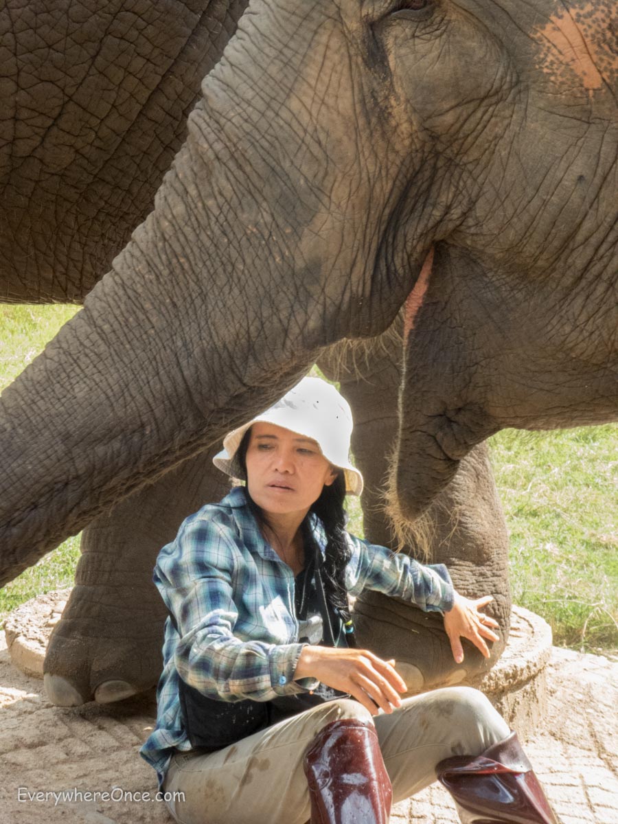 Most of the elephants at the park were rescued from the tourism industry and many still bear marks of abuse. We met one elderly elephant who was blinded by the constant glare of circus lights while another had her eyes put out as a disciplinary measure. Some were wounded by landmines and others were crippled by overwork.