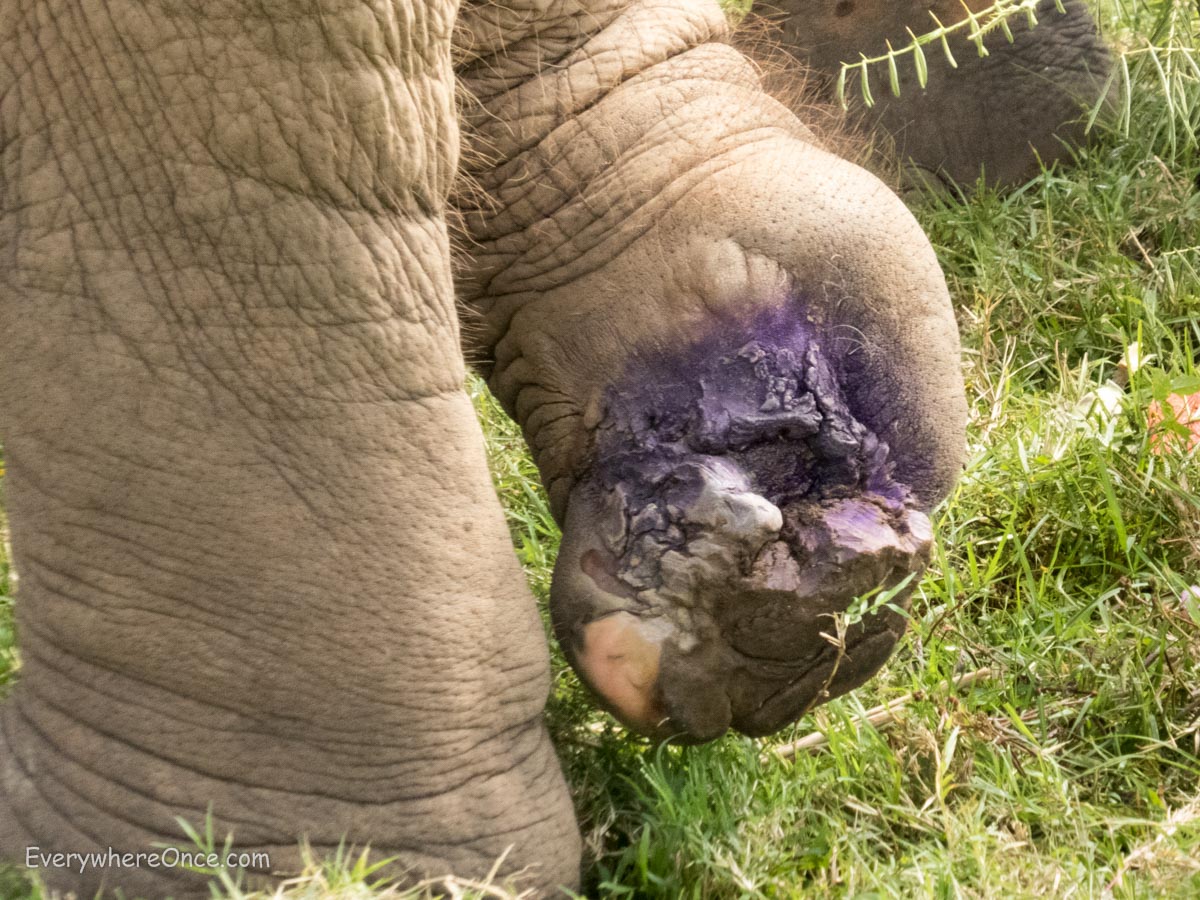 This elephant’s foot was damaged by a landmine. Now covered in purple antibiotics and healing under the care of The Elephant Nature Park