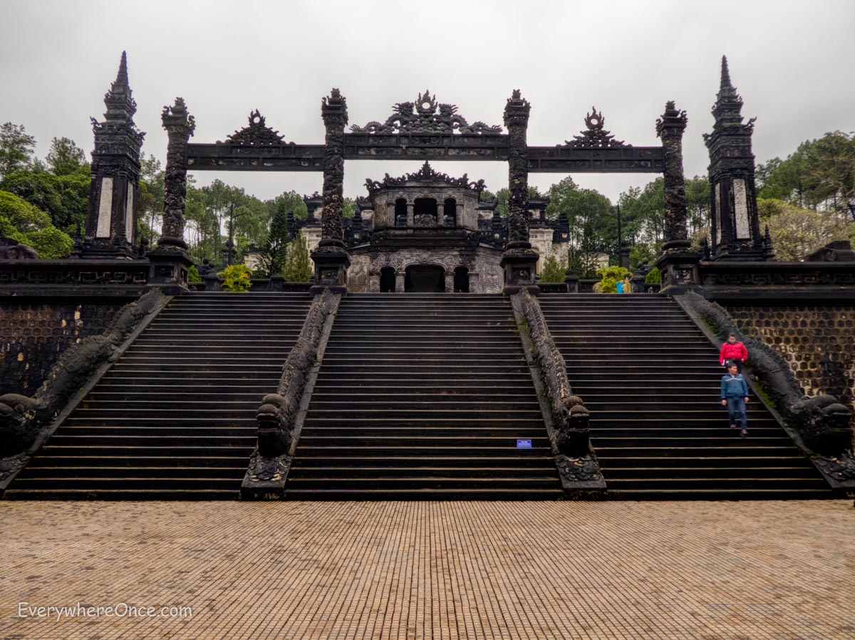 If anything, an overcast sky enhanced the somber grandeur of Emperor Khai Dinh’s imposingly grand, multi-tiered mausoleum on the slope of Chau Chu Mountain. Construction on the royal’s final resting place began in 1920, four years into his reign.