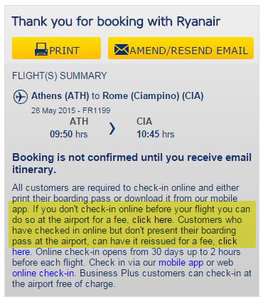 Today’s example comes courtesy of Ryanair, a well known champion of loading their teaser fares with hidden fees. One such fee we hadn’t encountered before is Ryanair’s requirement that passengers check-in and print their boarding passes prior to arriving at the airport. This is an especially tricksy surcharge considering how common it is to get your boarding passes from an agent or a kiosk at the airport.
