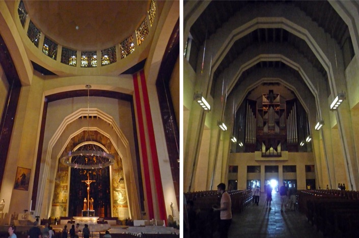 Getting into the basilica involves ascending several escalators that could just as easily connect floors in an office building.  The chapel itself is cavernous, but non-descript. Unadorned concrete pillars support a plain vaulted ceiling, which together hold up a similarly muted dome.