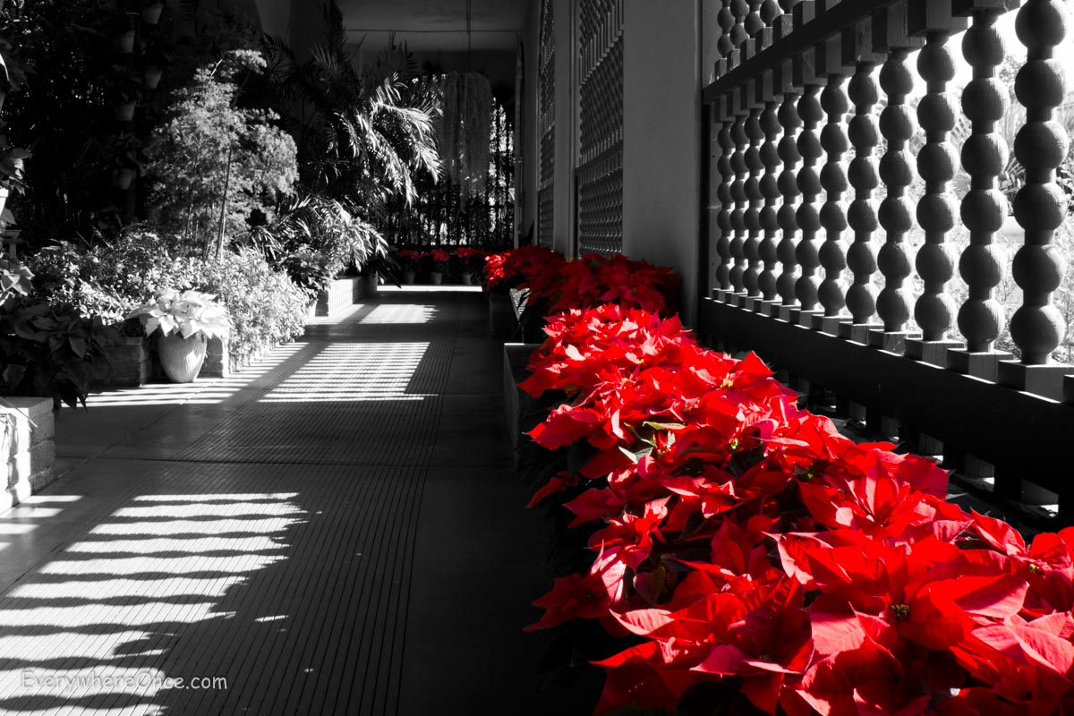 Bright afternoon sunlight not only set the poinsettias ablaze but also cast interesting and contrastingly dark shadows at San Diego’s Botanical Garden in Balboa Park.