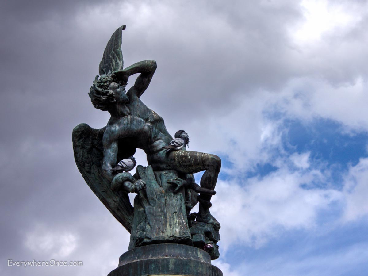 Rising an appropriate 666 meters above sea level, the statute of an angel bound by a snake, hair seemingly ablaze, falling backwards from the heavens is a striking sight. Even more so when the clouds cooperate the way they did on our visit.