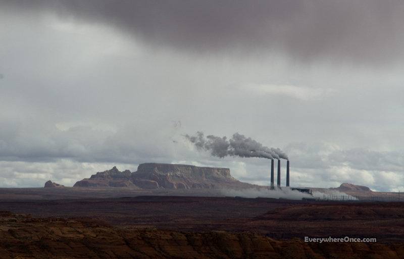 On a cold and cloudy day, billowing steam from the giant 2,250 megawatt coal-fired Navajo Generating Station gives the impression that this otherwise pristine desert landscape just outside Arizona’s Glen Canyon Recreation Area is really an industrial wasteland. On a clear day, though, the steam and fog dissipate to reveal majestic red rock buttes and a yellowish band of smog drifting downwind from the plant as far as the eye can see.